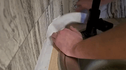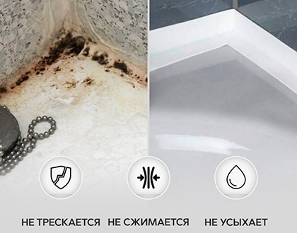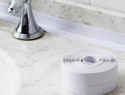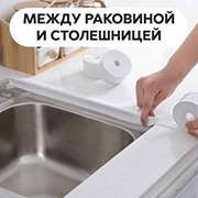 Мы предлагаем водонепроницаемую, устойчивую к плесени ленту, которую можно наклеить на шов между газовой плитой и столом, раковиной и столом, на плинтуса и окна. Лента самоклеящаяся, вам не нужно ничего, что поможет ее приклеить!